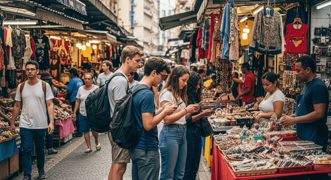 A vibrant scene depicting French tourists in Rio de Janeiro, using smartphones with Google Translate in a lively street market filled with colorful stalls and local vendors, embodying the cultural interaction and excitement of exploring a new city. No texts on scene. Keywords: photorealistic style, high resolution, 4k details, HDR, cinematic lighting, professional photography, studio lighting, vibrant colors.